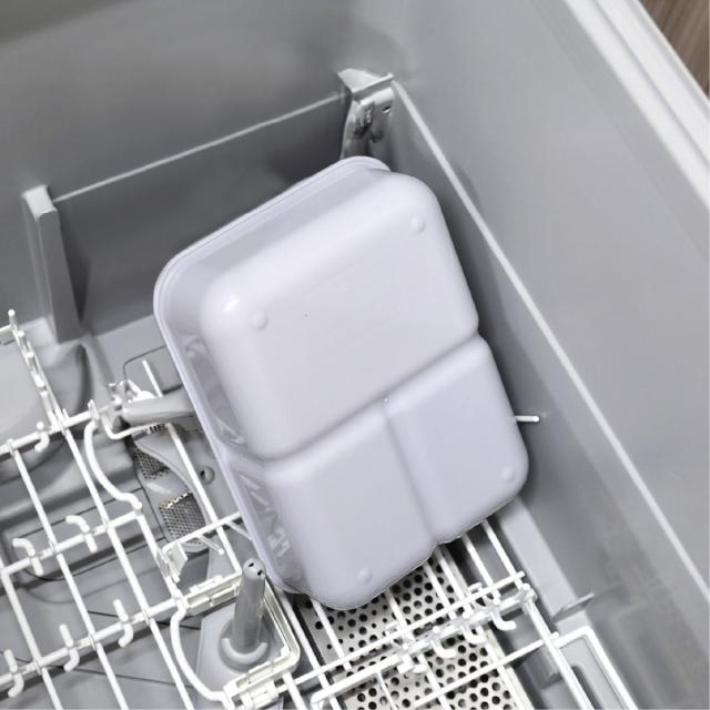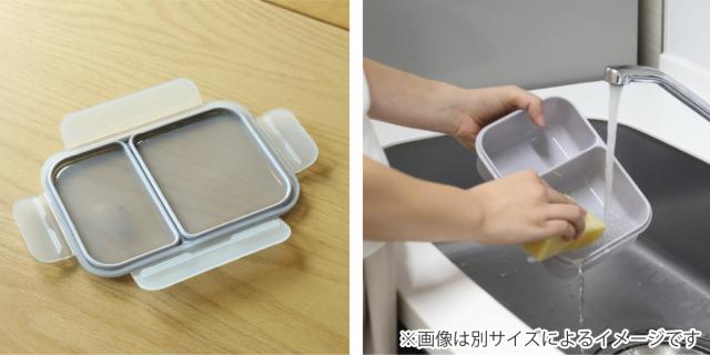 お弁当箱は蓋と本体の2パーツ構造です。汚れが入りにくい一体型パッキンの蓋と丸い角の本体はスポンジでも洗いやすいです。食洗機にも対応しているので、毎日のお手入れがラクにできます。