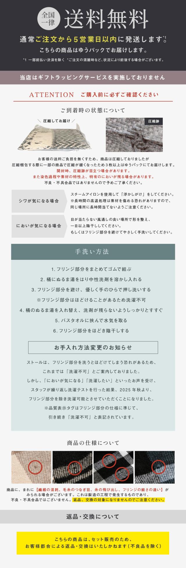 | ・品質表示タグはフリンジ部分の仕様に準じて「洗濯不可」と表記されていますが、フリンジ部分を避けての洗濯は可能です。 ・ただし、素材の特性上、ほつれの原因になりますので、フリンジ部分の洗濯はお避けください。 ・蛍光洗剤の入っていない洗剤を使用し、フリンジ部分を避けてやさしく手洗いしてください。 ・濃色品は摩擦により色落ちすることがありますのでご注意ください。 ・洗濯後は形を整えて、すぐに風通しのよい日陰に干してください。 |