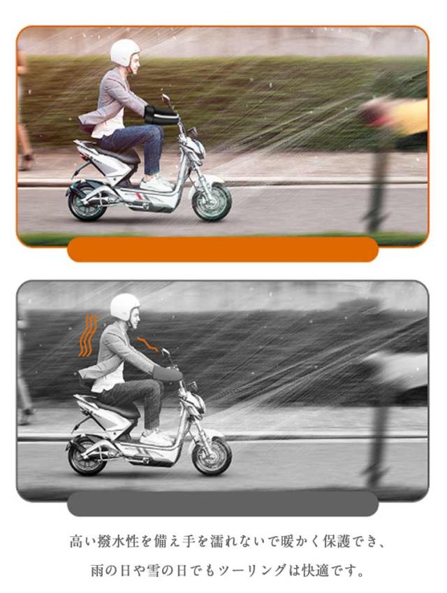 | 通勤や通学を暖かくサポートします。 汎用タイプ (ミニバイク、スクーター、ビックバイクまで幅広い車種の対応) 厚みのある生地を使って軽量で快適です。 耐スクラッチ性と耐老化性に優れています。 縫製の仕様ですがカバーの表面に撥水コーティングが加工されますので針跡より水が浸みることはありません。 高い撥水性を備え手を濡れないで暖かく保護でき、雨の日や雪の日でもツーリングは快適です。 | |