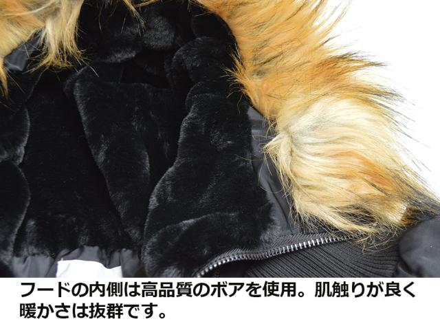 ■ファー付きフードの裏側は非常に肌ざわりの良いボリューム感のあるボア仕様。