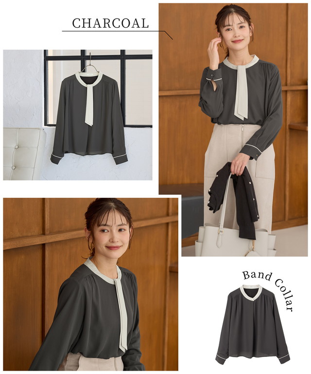 バンドカラーの衿と袖口も配色使いで、シンプルになりすぎないのも嬉しいポイント。