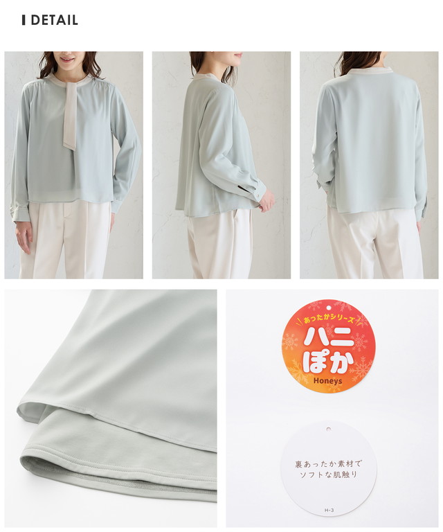 【WEB限定】あったか裏地配色ボウタイブラウス トップス ブラウス 長袖 ハニぽか あったか 大きいサイズ オフィス きれいめ ボウタイ レディース Honeys ハニーズ 【褒められ】裏起毛ボウタイブラウス