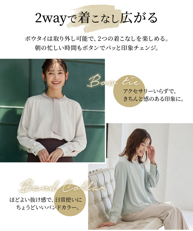 ボウタイは、シーンに合わせて印象を変えられる、取り外し可能な2Way仕様。
