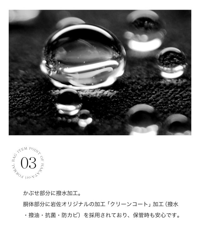 また、胴体部分に岩佐オリジナルの加工「クリーンコート」加工(撥水・撥油・抗菌・防カビ)を採用されており、保管時も安心です。いつまでもきれいな状態で長くご使用いただけます