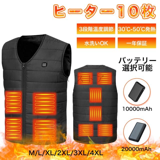 電熱ベスト 10箇所発熱 10000mAh/20000mAhバッテリー選択可 Vネック 3段階調温 ヒーターベスト 電熱インナーウェア ヒーター付きベスト バイク 防寒着 男女兼用