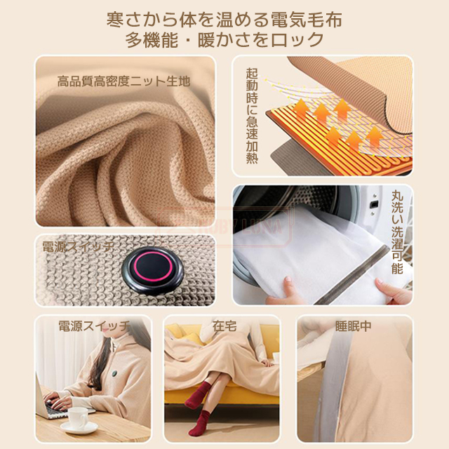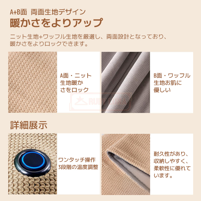 | お手入れ簡単&コンパクト収納 | ◆モバイルバッテリーを取り外して、洗濯機で洗えるので、手軽にお手入れできます。いつでも清潔に保てて、気持ちよく使い続けられます。 ◆軽くて折りたためるので、オフシーズンも省スペースで収納できます。 ◆従来のコンセント式ブランケットよりも、持ち運び・収納どちらもラクに。 |