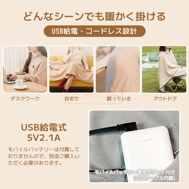| USB電源&コードレスでどこでも使える | ◆オフィスでのデスクワーク中、ソファでのリラックスタイム、寝る前のひとときにも。 ◆USB接続で簡単に使え、モバイルバッテリー(別売)を使えば外出先でもコードレスで暖まれるので、キャンプや車内でも大活躍。 ◆コンセントを探す手間もなく、使いたい場所にサッと持ち運べます。 |
