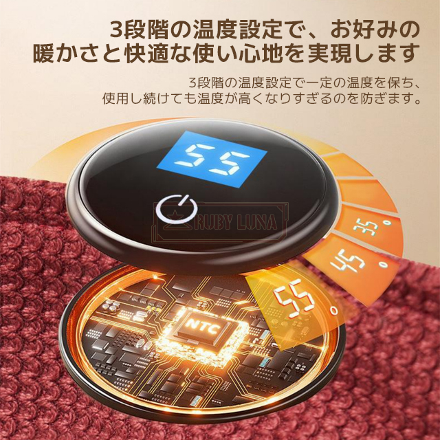 | 3段階温度調節&15秒で即暖 | ◆ワンタッチで 高温(約55℃)・中温(約45℃)・低温(約35℃) を切り替え可能。 ◆スイッチを入れてわずか15秒でぽかぽかに。 ◆その日の気分や環境に合わせて、ちょうどいい温かさを選べます。 |