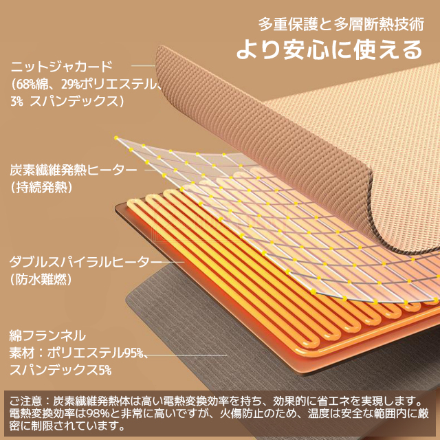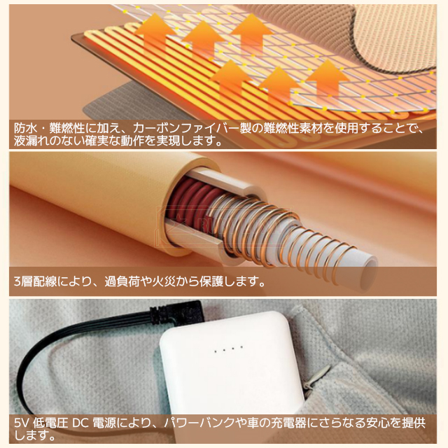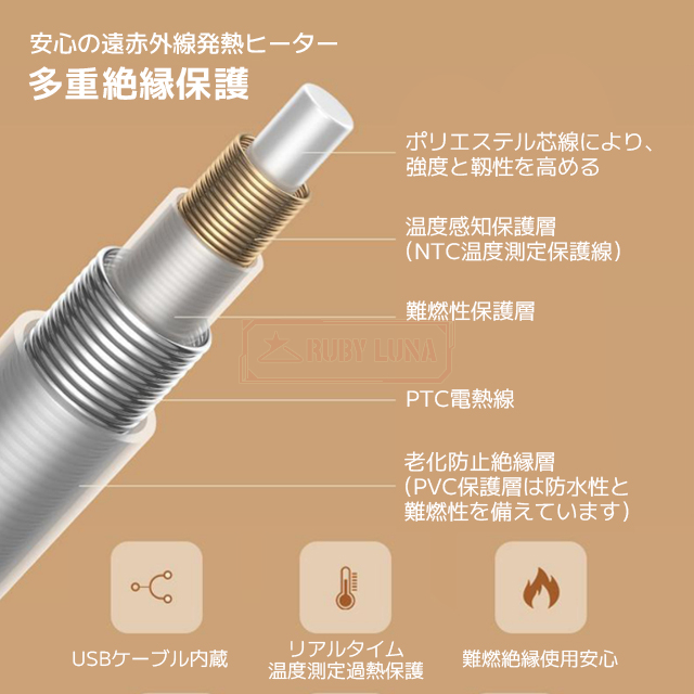 | 多重安全保護設計 | ◆耐熱・耐水・防火機能を搭載しているので、安全に長時間使えます。 ◆使っている間も安心して過ごせます。 |