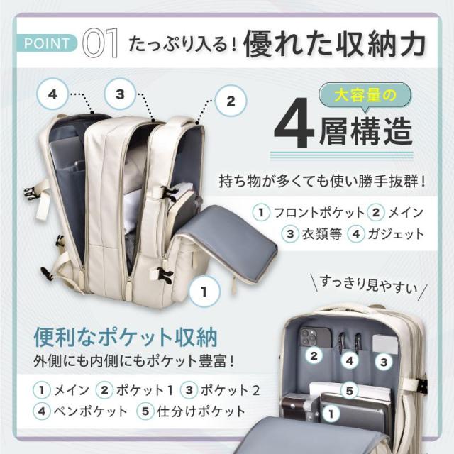ポケットがたくさんついていてたくさんの荷物を持ち歩くのに便利で、通勤、通学、出張、旅行、キャンプ、アウトドア、など幅広く活用できます。