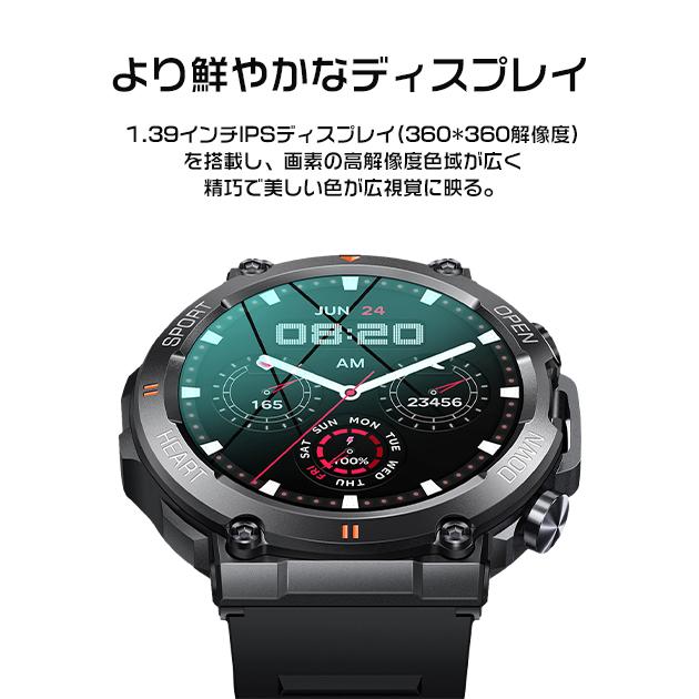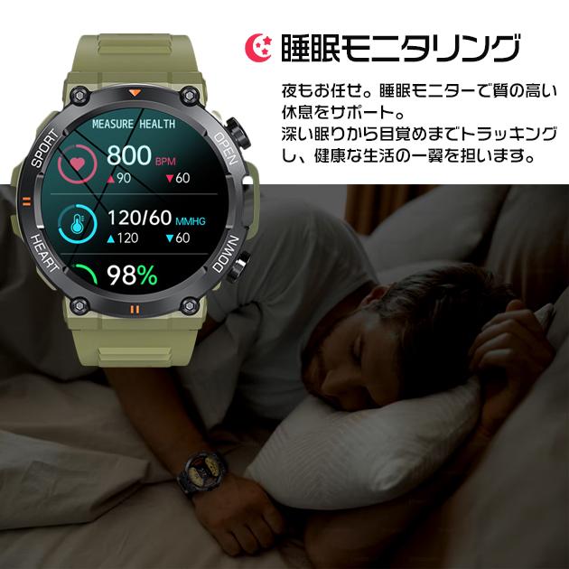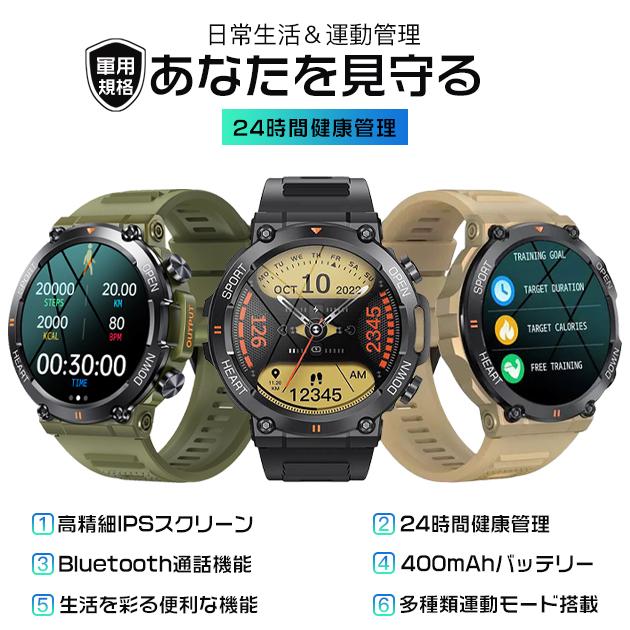 スマートウォッチ 軍用規格 丸型 軍用 スマート ウォッチ 体温測定 血圧 スポーツウォッチ 通話機能 メンズ iPhone対応 着信&line通知