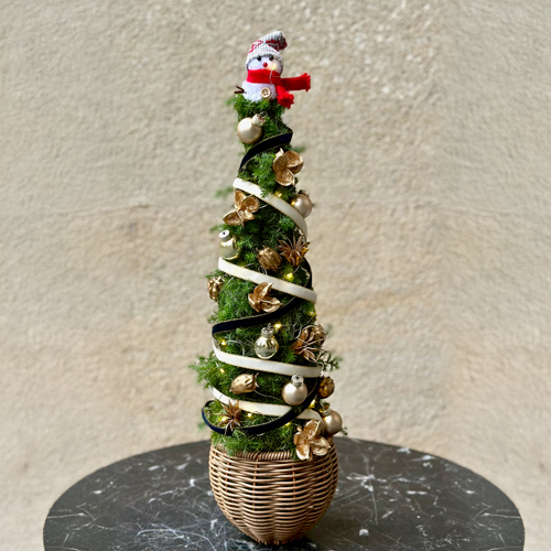 ナチュラルコニファーでデザインしたテーブルサイズの小さなクリスマスツリー。