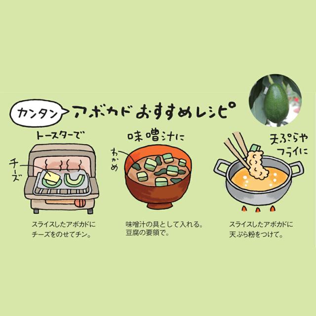 中島では、ベーコン、フェルテ、ピンカートンの3種類を栽培しており、果実の収穫は11〜12月ごろ以降に行います。濃厚なコクと滑らかな口当たりで、外国産の物よりも大きく育ちます。また、アボカドは栄養価が豊富で、アボカドに含まれるオレイン酸は善玉コレステロールを増やす働きがあることや、若返りビタミンと呼ばれるビタミンEをはじめ、20種以上のビタミンやミネラルが含まれており、世界一栄養価の高い果物と言われております。
