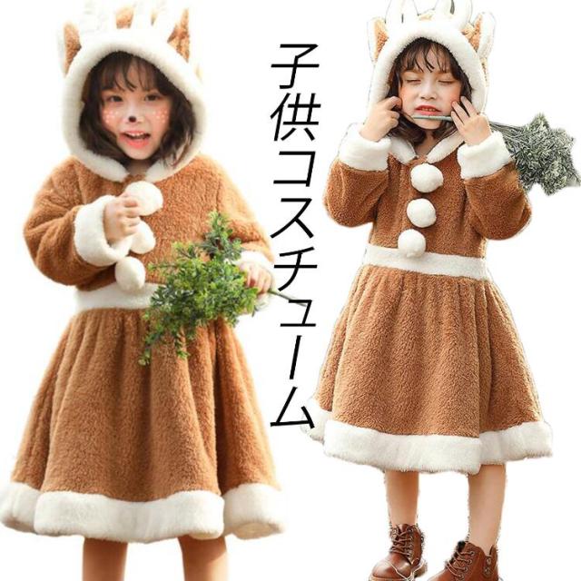 コスチューム 子供用コスチューム キッズクリスマス衣装 ワンピース もこもこ トナカイコスチューム なりきり 女の子部屋着 ルームウェア フード付き コスプレ衣装 変装 仮装 クリスマスパーティー イベント 舞台劇 舞台衣装 学園祭 ブラウン