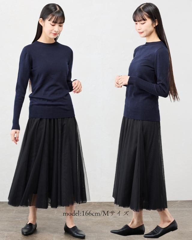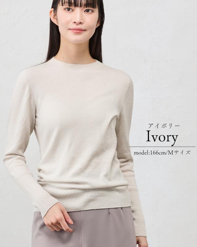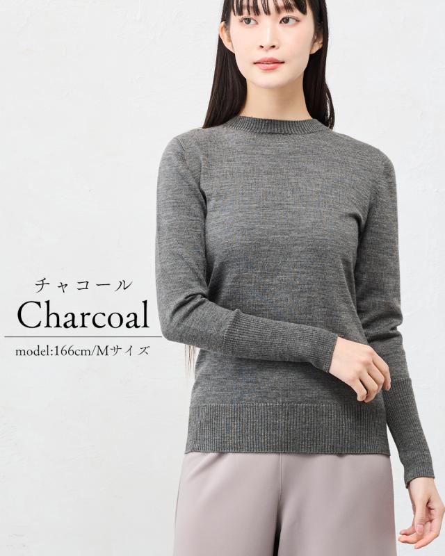 首まわりをすっきり見せるクルーネックは、重ね着がしやすく季節を問わず使えるのも魅力。