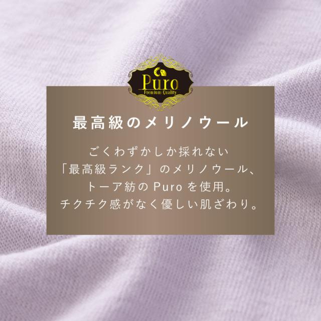 メリノウールの中でもごくわずかしか採れない「最高級ランク」のメリノウール(15.5マイクロメートル)とされる、トーア紡のPuroのメリノウールを使用しています。カシミヤと同等クラスの細さで、チクチク感がなくやさしい肌ざわり。敏感肌の方やシニアの方でも安心して着用いただけます。