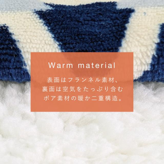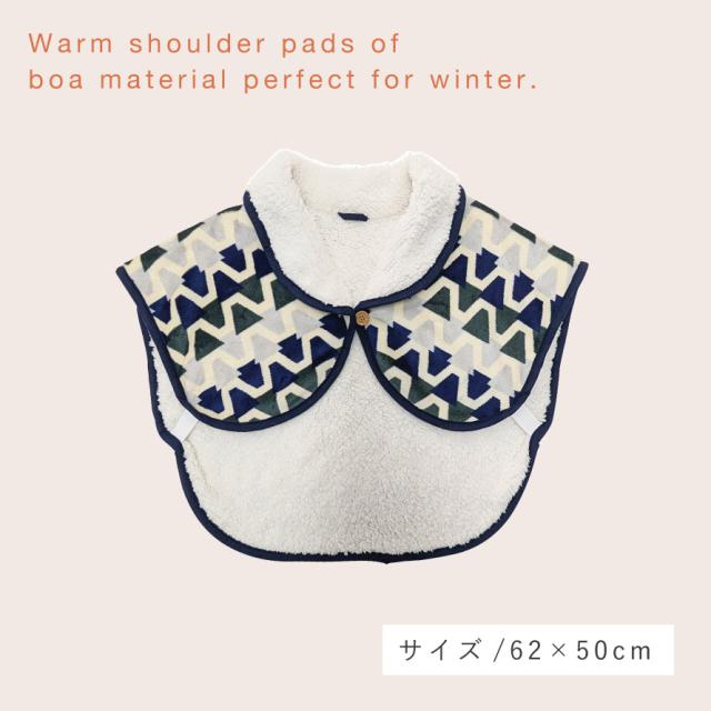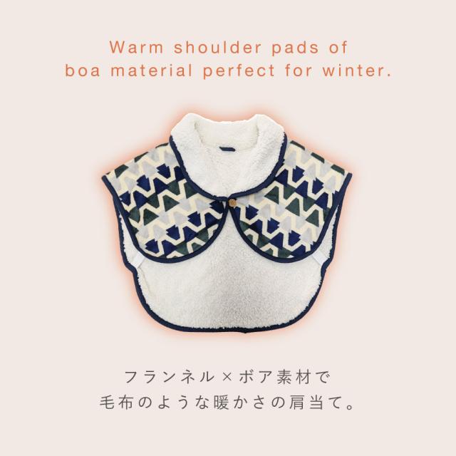フランネル×ボア素材で毛布のような暖かさの肩当て。表面は肌触り優しいフランネル素材、肌にあたる面は、空気をたっぷり含むボア素材の二重構造。