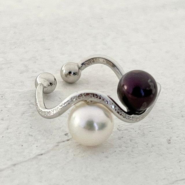 二見結ひ シルバーイヤーカフ|淡水真珠ホワイト&ブラック5.0mm 夫婦岩モチーフ・ピアスホール不要