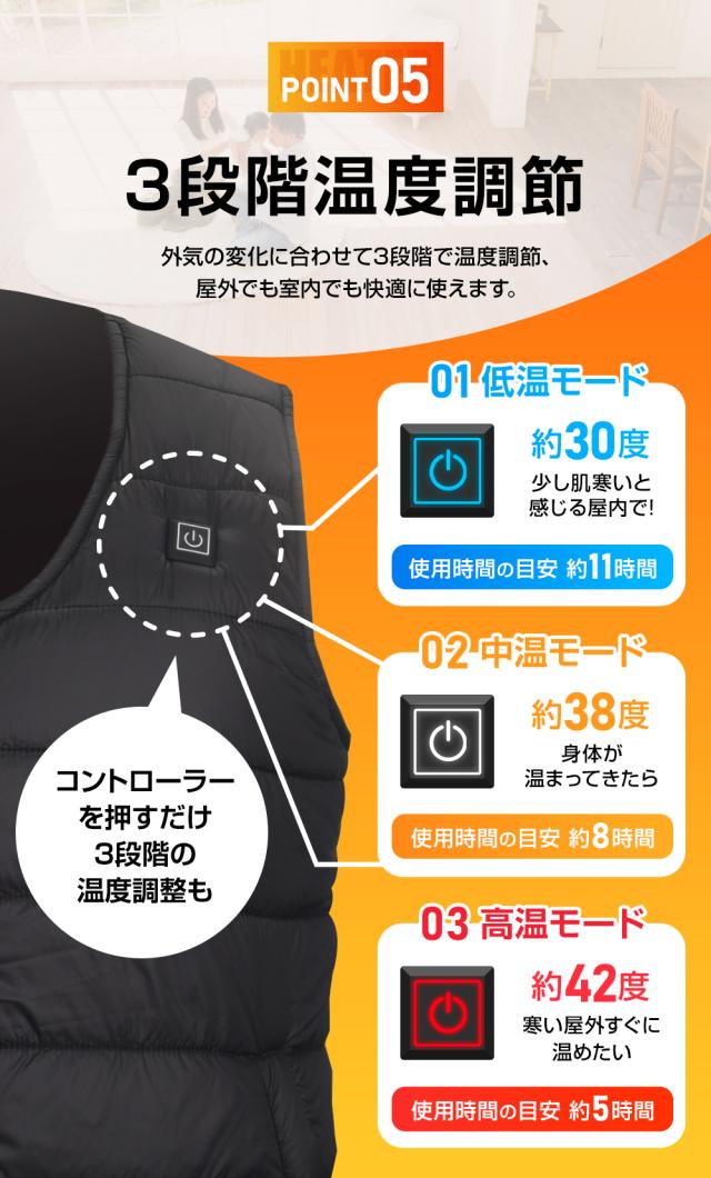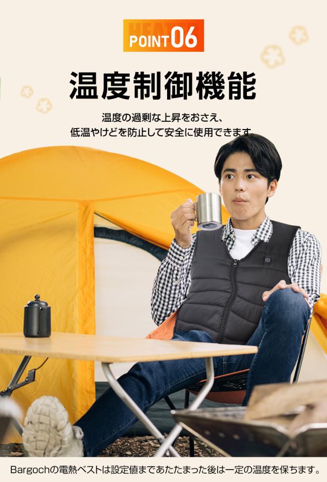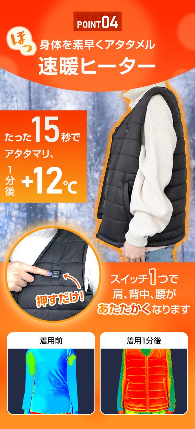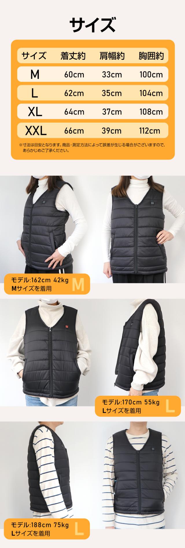 - 配送の速い製品で有り難かったです、 製品のベストは軟らかい素材で仕上げられて軽く、左右ポケット付き、 左ポッケ内にキャップ付きUSB- Aタイプケーブルが在りモバイルバッテリーに接続しての保管に便...