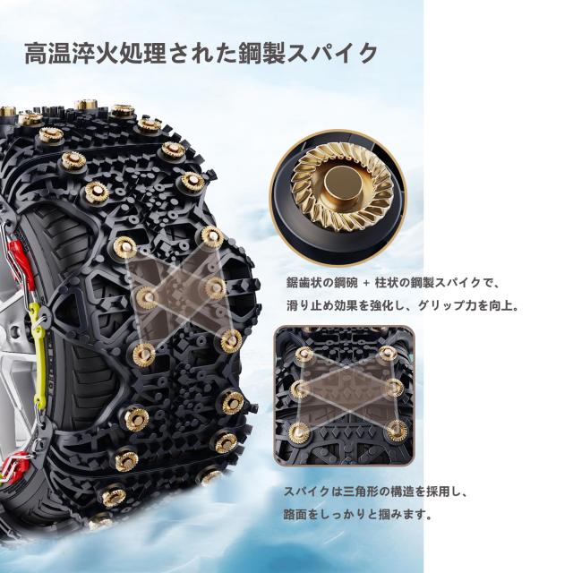 【高品質なTPU素材と高耐久スパイク】高温淬火処理された鋼製スパイクと鋸歯状の鋼碗 柱状スパイクで、優れたグリップ力と耐摩耗性を実現。さらに、柔軟性の高いTPU素材を使用しており、-50度までの低温環境でも割れにくく、安定した走行をサポートします。これにより、自動車 タイヤ チェーンとして信頼性が高いです。