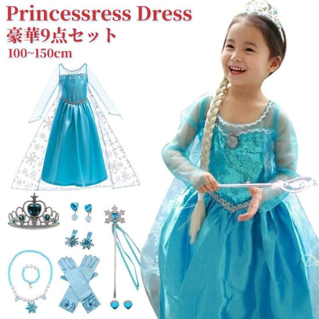 プリンセス ドレス 子供 コスチューム 豪華9点セット アクセサリーセット エルサ クリスマス 雪の女王 ワンピース 女の子 アニメ お姫様 仮装 誕生日