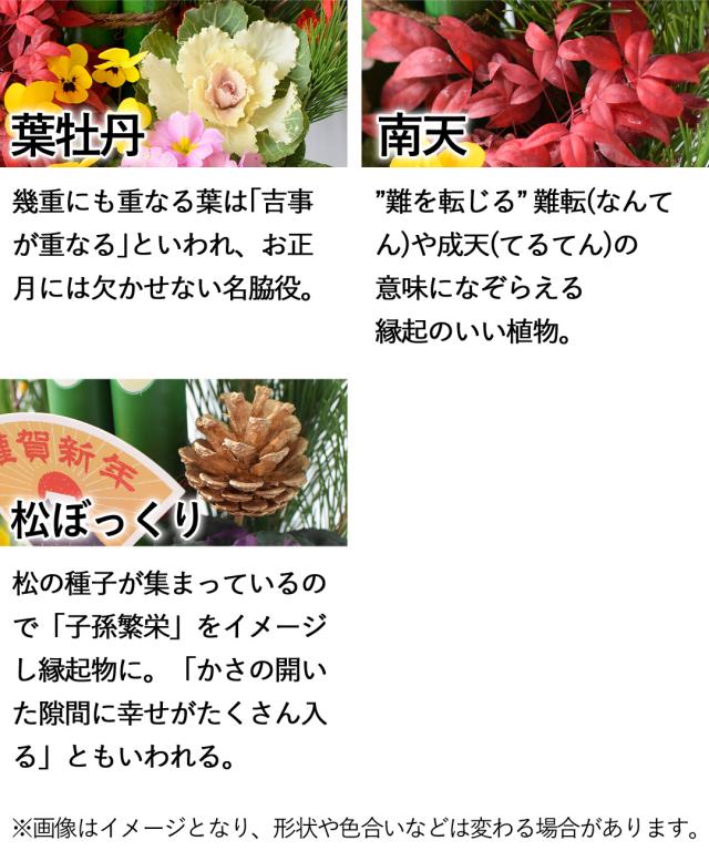 葉ボタンや松が迎春ムードを演出します。