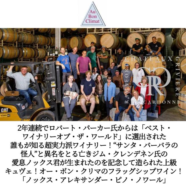 2年連続でロバート・パーカー氏からは「ベスト・ワイナリーオブ・ザ・ワールド」に選出された誰もが知る超実力派ワイナリー!“サンタ・バーバラの怪人”と異名をとる亡きジム・クレンデネン氏の愛息ノックス君が生まれたのを記念して造られた上級キュヴェ!オー・ボン・クリマのフラッグシップワイン!「ノックス・アレキサンダー・ピノ・ノワール」