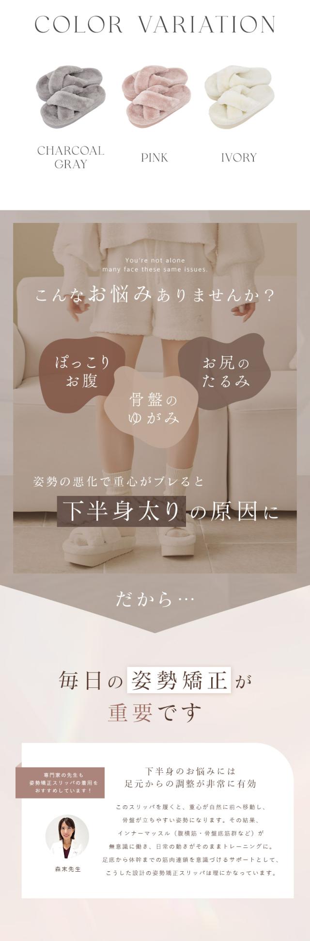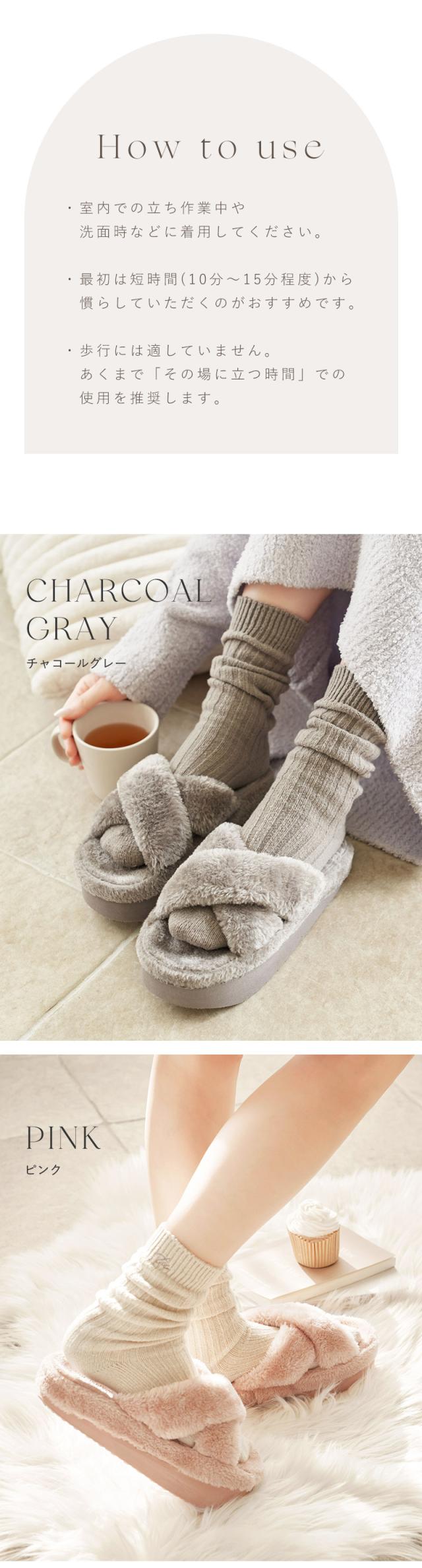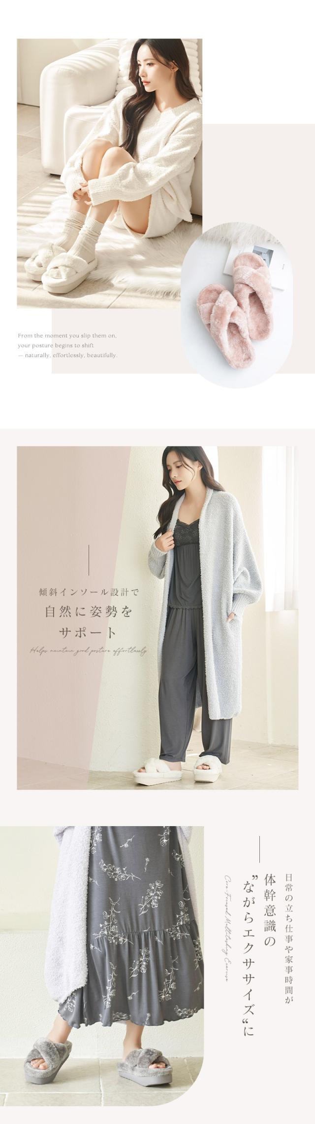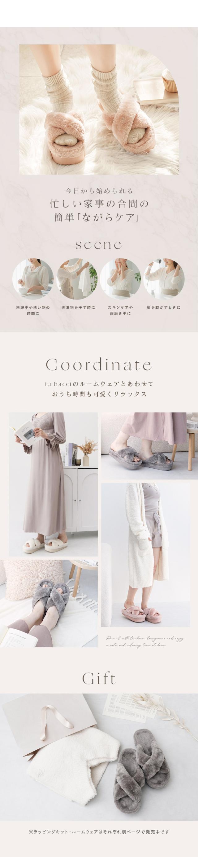 tu-hacci Legwear Collection 履くだけで体幹を整える ルームスリッパ 傾斜インソール設計で自然に姿勢をサポート。 お腹・脚・背筋にアプローチしながら足元から美しさを整えます。 健康に気を使いたいけれど、運動の時間を取れない現代女性におすすめの一足。 【こんな方におすすめ】 ・下半身太りに悩んでいる ・エクササイズの時間が取れない ・姿勢を美しく整えたい ■忙しい家事の合間の簡単「ながらケア」 かかと側が低い設計で、体がバランスを保とうと自然に前重心に。 骨盤が立ちやすい姿勢となり、結果としてインナーマッスルが無意識に働くため、家事の時間がそのままトレーニングになります。 大人可愛いファッショナブルなデザインは、ギフトにもおすすめ。 ≫ ギフトラッピングはこちら ≪ |