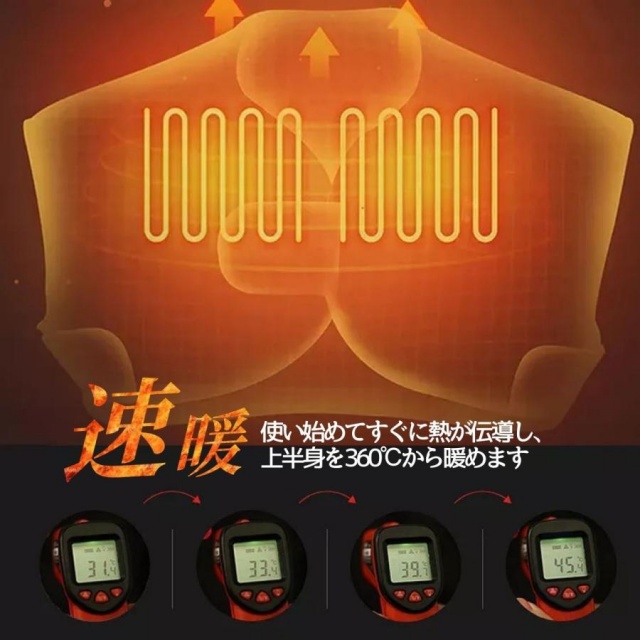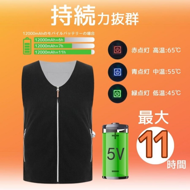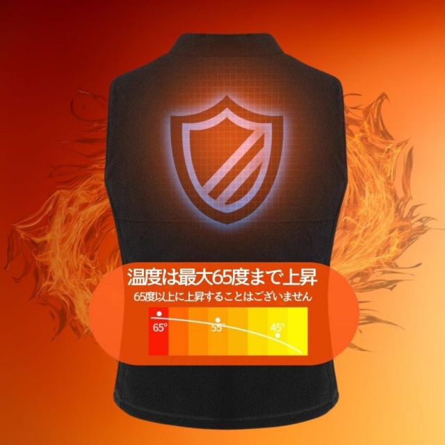 このヒーターベストはボタンを押すだけの簡単操作で、温度を45℃〜65℃の範囲で低・中・高三段階調節できる防寒ベスト!