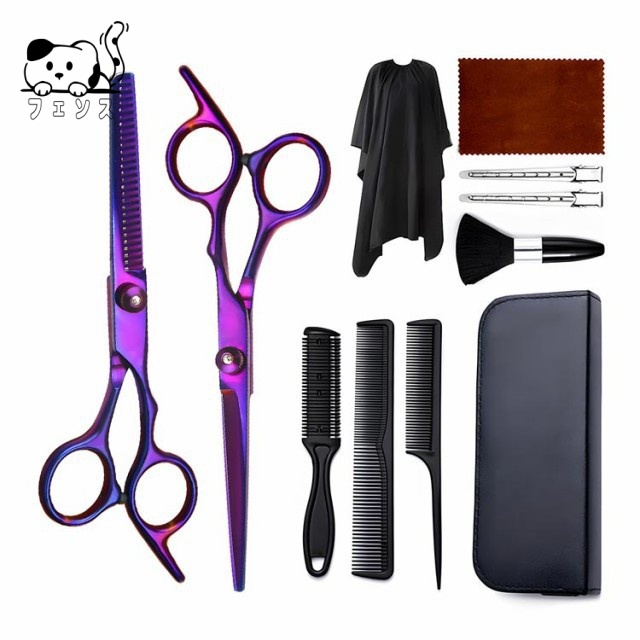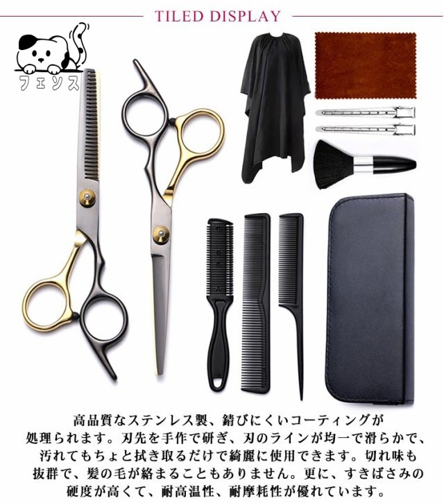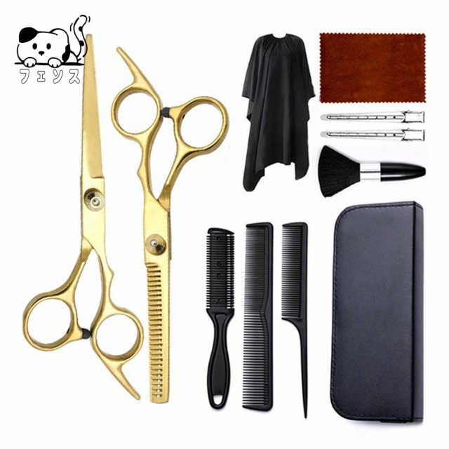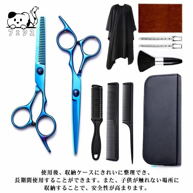 | サイズについての説明 | セット内容:すきバサミ1本、カットハサミ1本、ケープ1枚、ブラシ1本、櫛3本、髪留め2本、布巾1枚、収納ケース1個。 |