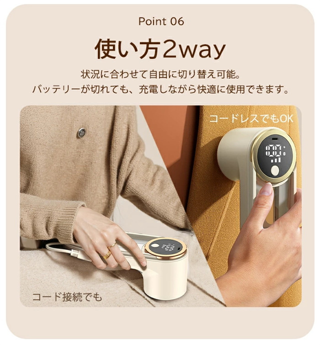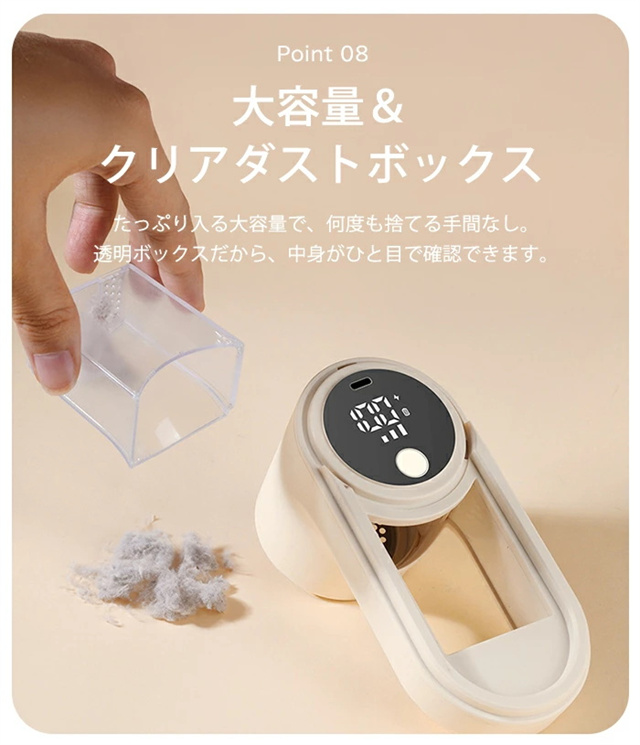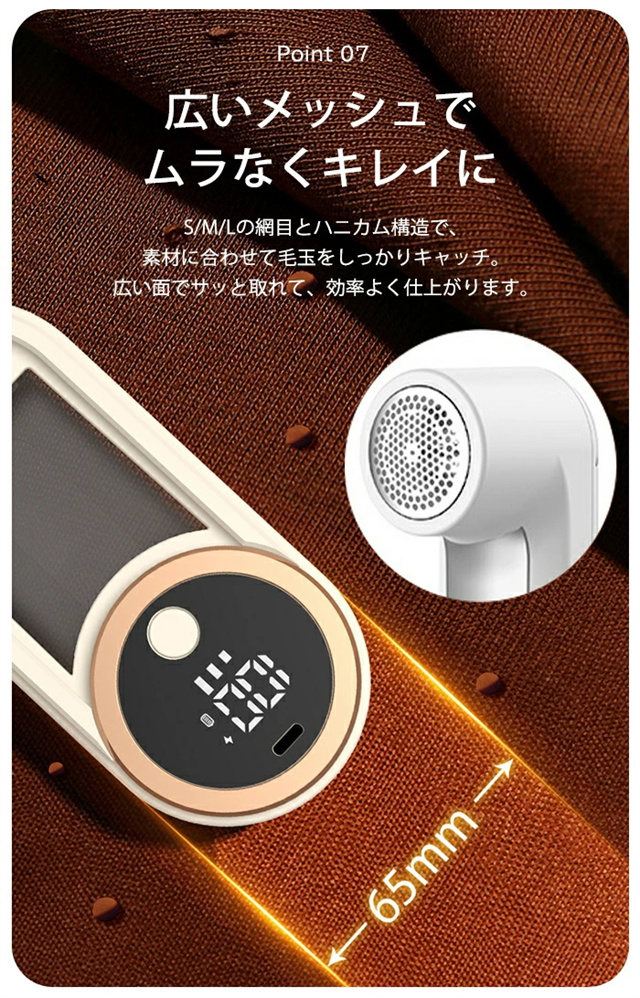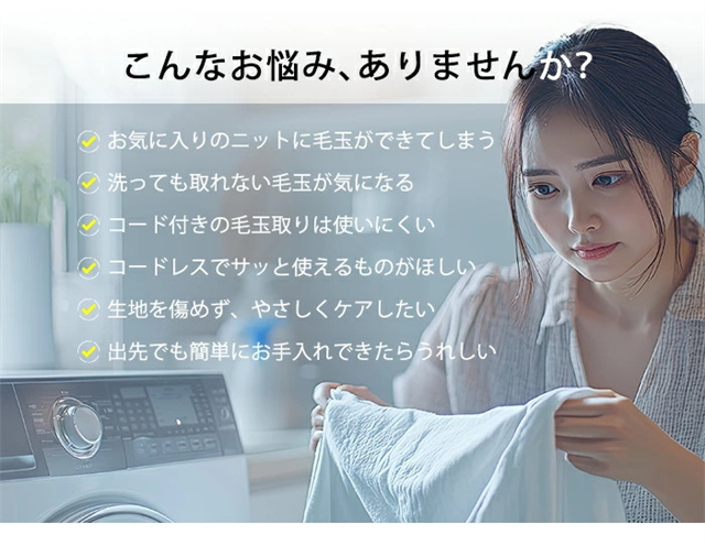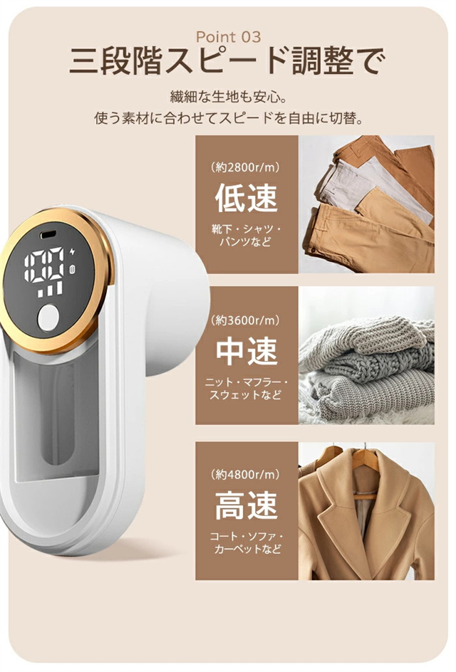 | 特徴 | 【 毛玉取り器|電動6枚刃&充電式コードレス仕様 】 衣類ケアの新定番。毛玉取り(けだまとり)・毛玉クリーナー・リムーバーとして、 電動パワーで毛玉をすばやくカットし、生地を傷めずキレイに整える毛玉取り器です。 洋服・ニット・コート・カーディガンなどの毛玉取りに最適。 家庭用から業務用まで対応できるハイパワー仕様で、毎日の衣類を美しくキープ。 【特長】 強力6枚刃の電動毛玉取り機(毛玉取り器)は、高速回転で毛玉をすばやく除去。 生地を傷めない構造で、繊細な素材にも安心。 3段階スピード調整が可能で、衣類の厚みに合わせてケアできます。 コードレス+USB充電式兼用で、どこでも手軽に使える便利な充電式タイプ。 大容量&透明ゴミポケット付きでお手入れ簡単。 LEDディスプレイ搭載で、電池残量やスピードをひと目で確認。 安全装置付きで誤作動を防止。替え刃付きで長く使えます。 業務用レベルのパワーながら、家庭用にも最適なコンパクト設計。 エチケットブラシ付きで、仕上げもスムーズ。 【使い方・シーン】 洋服やニット、毛布、ソファなどあらゆる生地の毛玉取りに。 コードレスだから、外出先や旅行、出張時にも活躍。 USB充電式なので、パソコンやモバイルバッテリーからも充電可能。 家庭用・業務用のどちらにも対応し、いつでも清潔で快適な衣類ケアが可能。 【メンテナンス】 ゴミポケットは簡単に取り外して洗える設計。 本体は乾いた布で軽く拭き取るだけでOK。 安全ロック付きで刃部分の掃除も安心して行えます。 |