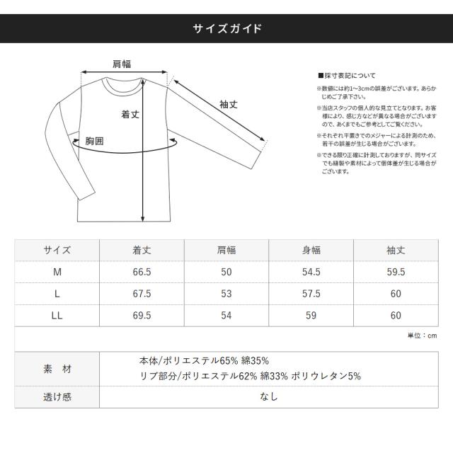 LL:身幅59cm 肩幅54cm 着丈69.5cm 袖丈60cm