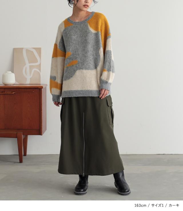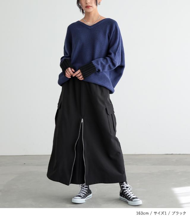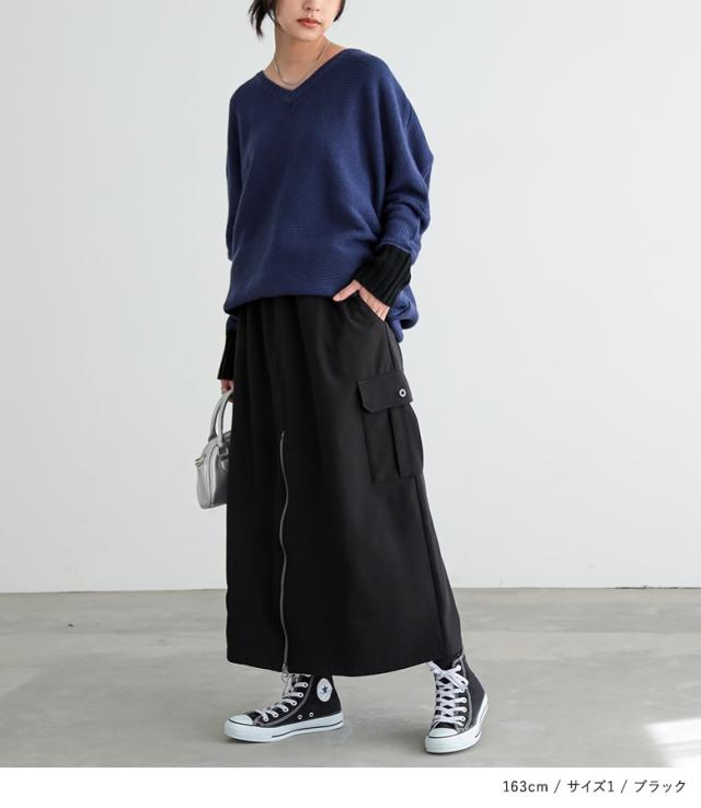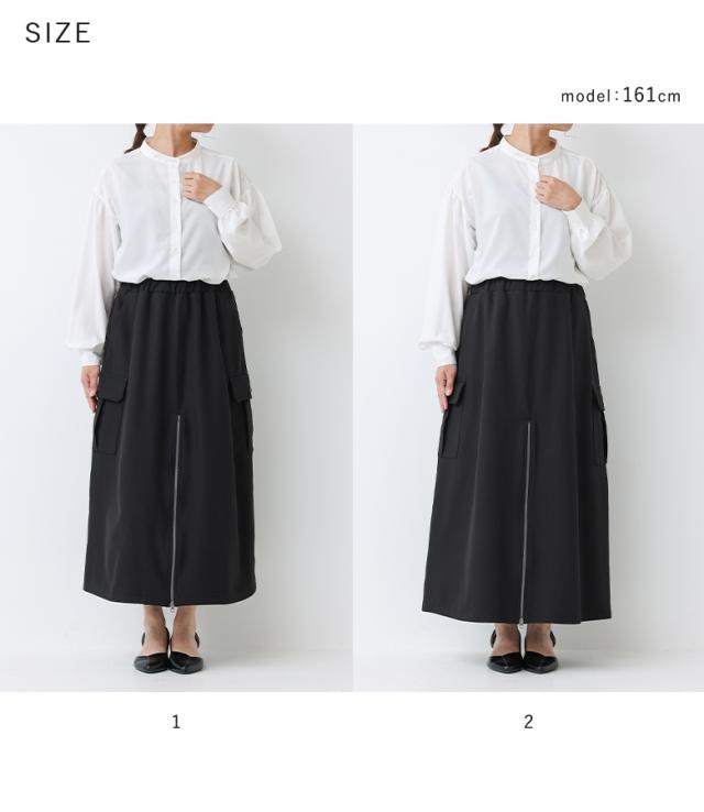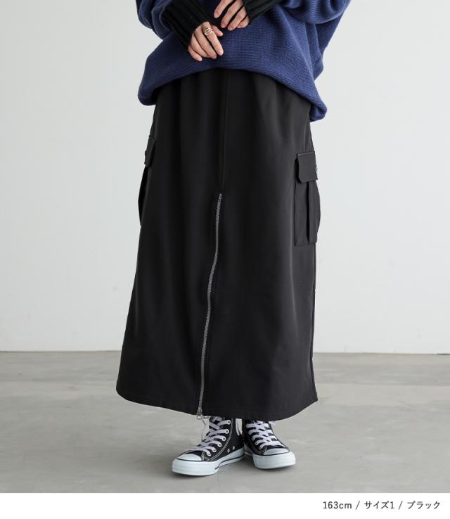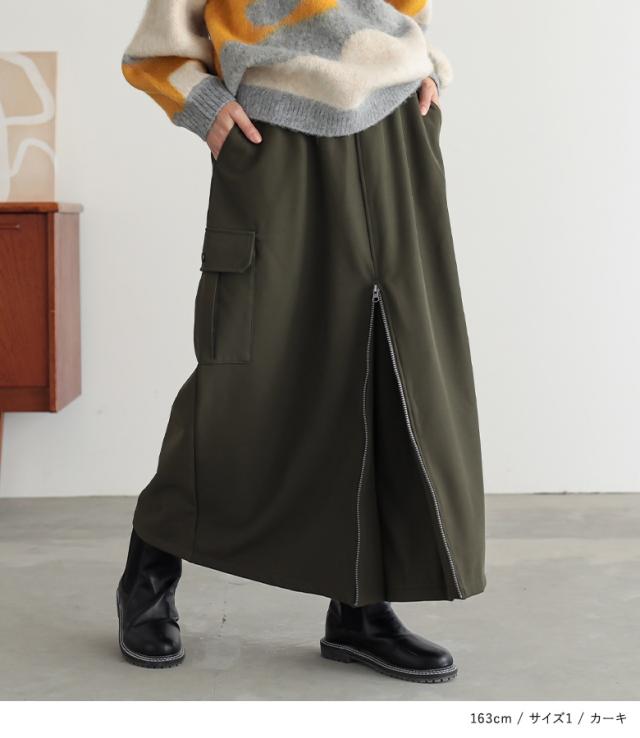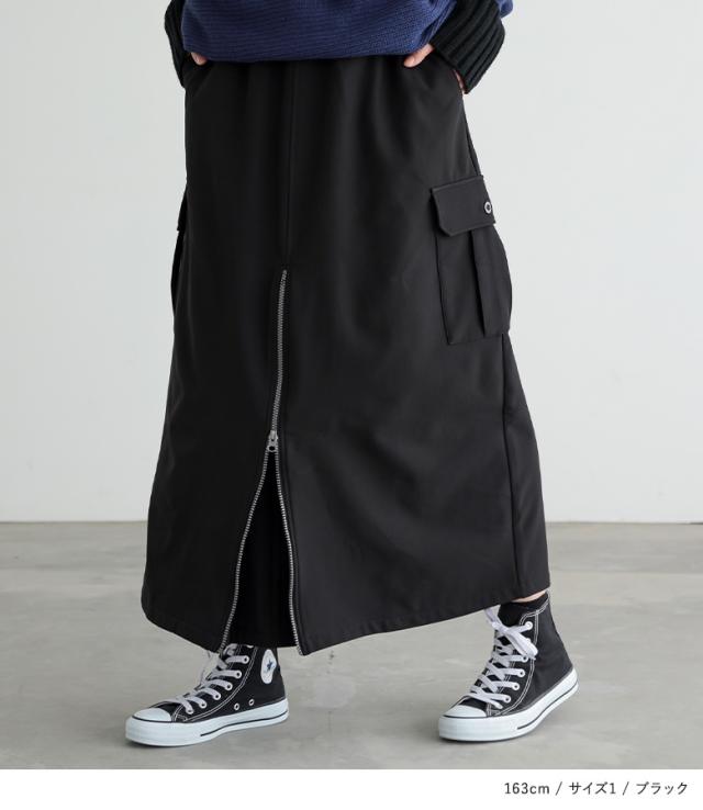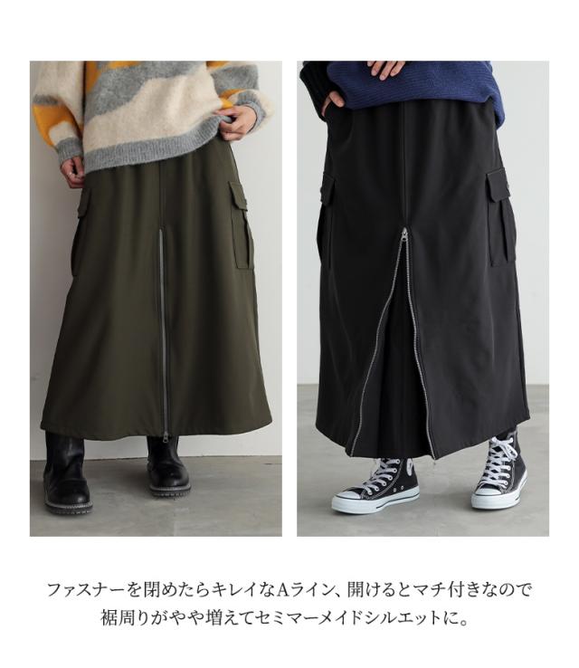 <冬新作>『裏起毛センタージップカーゴスカート』【メール便不可】【30】[スカート 裏フリース あったか レディース ボトムス ロング丈 カーゴスカート Aライン セミマーメイド ファスナー ウエストゴム 秋 冬]
