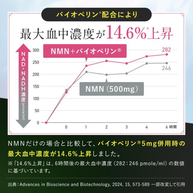 【NMNの吸収効率を向上】特許成分バイオペリンを推奨量5mg配合。黒胡椒由来のピペリンがNMNの吸収をサポートします。バイオペリン併用時におけるNMN吸収効率が向上されたことが、臨床試験において確認されています。