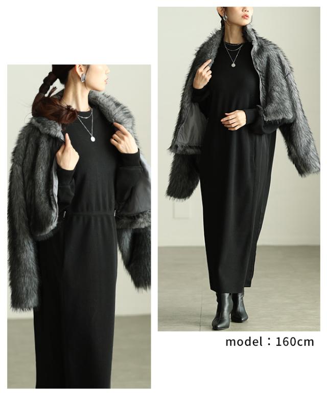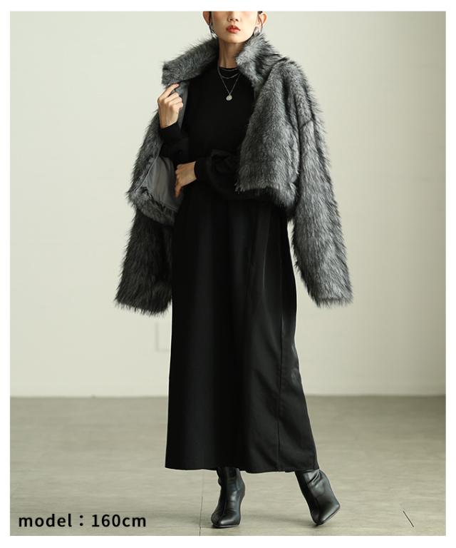 着丈は骨盤が隠れるくらいです。袖は手が隠れます。脇グリも身幅も余裕があり楽に着用出来ました。首元はハイネックで顎下までありとても暖かいです。丈が短めなのでバランス良く着用出来ました。柔らかいファーで軽くて肌触りよく着心地良かったです。