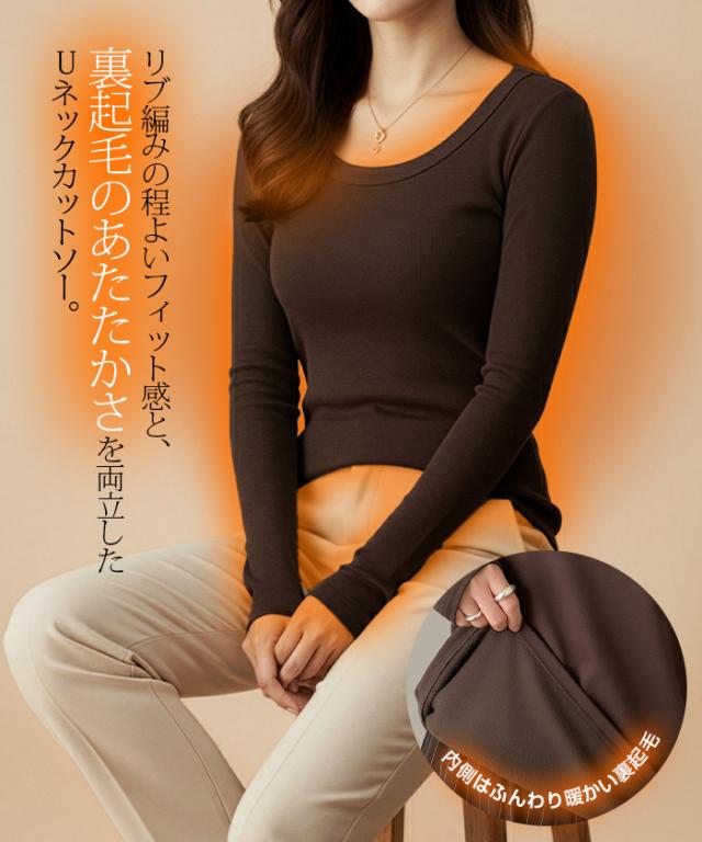 60%OFFクーポン!裏起毛 Uネック tシャツ 深め ラウンドネック レディース 長袖 カジュアル ロンT カットソー 秋冬 冬 きれいめ ルームウエア オシャレ 無地 女性用 レーヨン 【 Uネック裏起毛リブカットソー 】 ダークエンジェル trend_nit c_bag