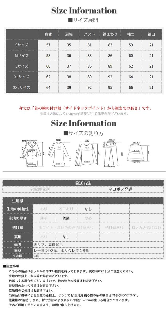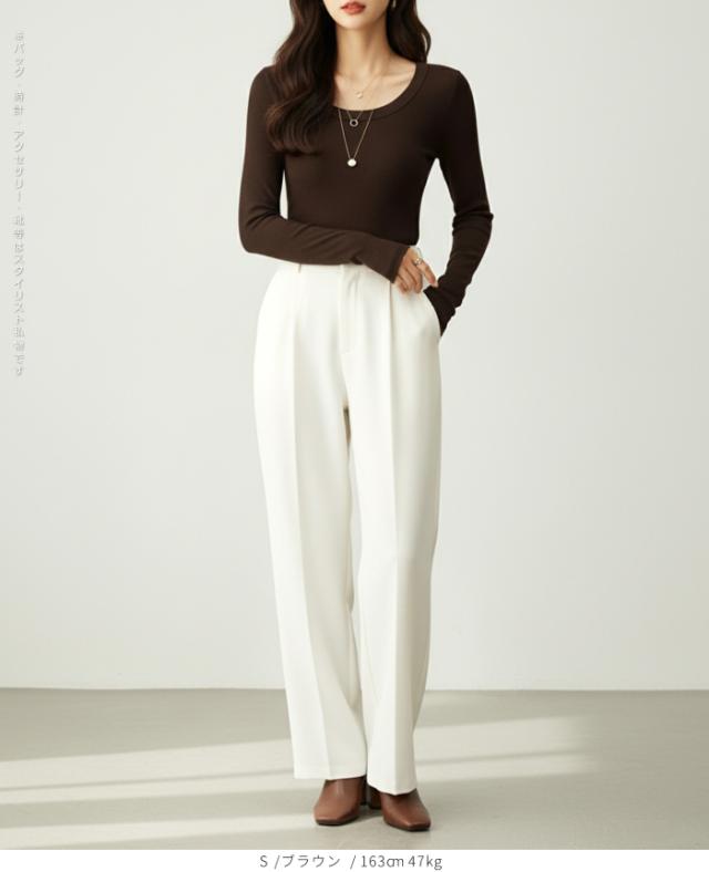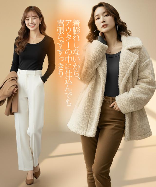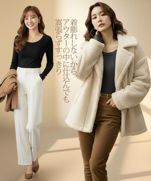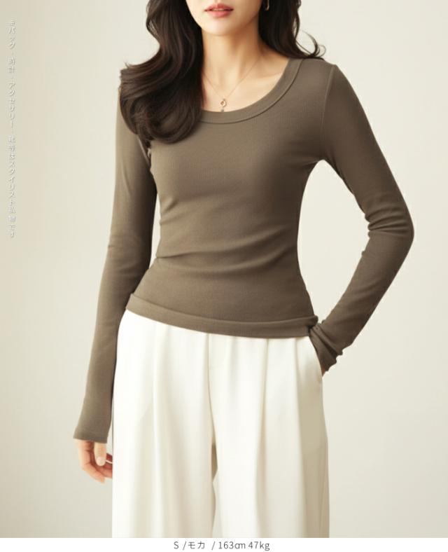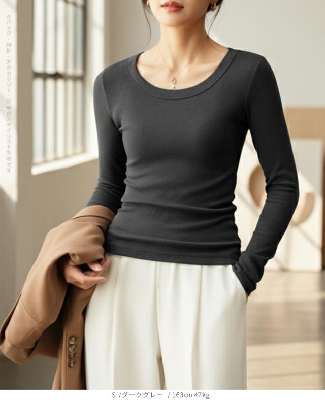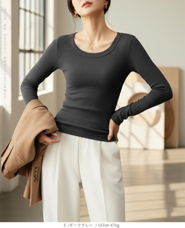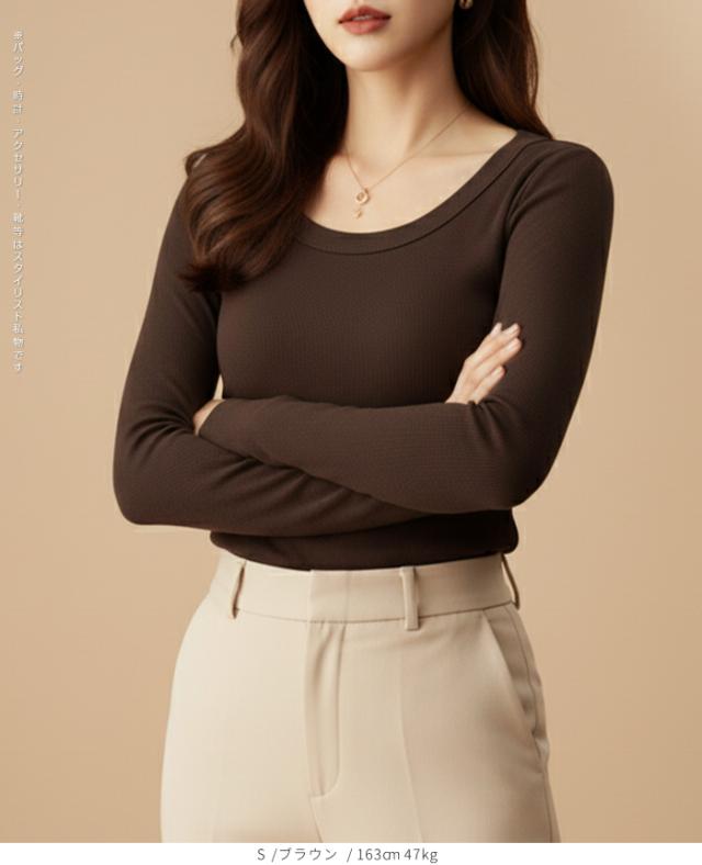 【 Uネック裏起毛リブカットソー 】 見た目はすっきり、着心地はふんわり。 リブ編みの程よいフィット感と、裏起毛のあたたかさを両立したUネックカットソー。 1枚でもインナーとしても使える万能アイテムです。 上品なリブ素材がボディラインを美しく見せ、 ふんわり裏起毛が冬の寒さからやさしく包み込みます。 重ね着してももたつかず、着ぶくれ知らずのスマートなシルエット。 デイリーにもオフィスにも、秋冬のワードローブに欠かせない一枚です。 《商品ポイント》 ・なめらかで柔らかな裏起毛仕様 ・肌触りの良いレーヨン混リブ生地 ・ボディラインを拾いにくい程よいフィット感 ・開きすぎないUネックで上品な印象 ・インナーにも1枚着にも使える着回し力 《デザイン・シルエット》 ・女性らしい丸みを引き立てるUネックライン ・リブの縦ラインでスタイルアップ効果 ・身体に沿いながらも締め付け感のない伸縮素材 ・すっきり細見えのキレイシルエット設計 ・長め袖丈で手元までぬくもり感をプラス 《コーディネート提案》 ・テーラードジャケットやカーディガンのインナーに ・ワイドパンツやタイトスカートと合わせてきれいめカジュアルに ・デニムやジョガーパンツでデイリーなリラックスコーデに ・ジャンスカやサロペットのインナーとしてもおすすめ ・首元のUラインに華奢なネックレスを添えて、フェミニンな印象に 《サイズ・カラーバリエーション》 サイズ:S / M / L / XL / 2XL カラー:ブラック / ホワイト / ブラウン / モカ / ダークグレー 《素材・機能性》 ・素材:レーヨン92%、ポリウレタン8% ・透け感:なし ・伸縮性:若干あり ・厚み:普通 |