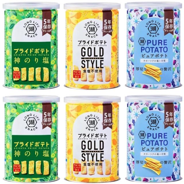 | 商品の説明 | 商品の説明 【製造から5年保存可能なポテトチップス】 ・KOIKEYA LONG LIFE SNACK プライドポテト 神のり塩(1缶43g当たり) 三種ののり(青のり・あおさ・焼のり)をたっぷりと使用。 華やかに香り立つのりと、じゃがいもの濃い旨みが織りなす贅沢な味わい。 のりと塩の湖池屋秘伝のブレンドに、 唐辛子とごま油をほんのりきかせた、 神がかったおいしさです。 <賞味期限:製造日より5年> 原材料・成分 馬鈴薯(日本:遺伝子組換えでない)、植物油(ごまを含む)、香味油、デキストリン、食塩、焼のり、あおさ、青のり、粉末ごま油、酵母エキスパウダー、香辛料/調味料(アミノ酸等) ・KOIKEYA LONG LIFE SNACK プライドポテト ゴールドスタイル 食塩不使用(1缶43g当たり) まるで塩を使っているかのような、食塩不使用ポテトチップスが登場。 プライドポテト独自の製法で引き出されたじゃがいも本来の旨み、甘みに 隠し味として香りと少しの酸味と加えることで、食塩不使用なのに満足感の高い味わいです。 <賞味期限:製造日より5年> 原材料・成分 馬鈴薯(日本:遺伝子組換えでない)、植物油、風味オイル、ぶどう糖、デキストリン、酵母エキスパウダー、オニオンエキスパウダー、たんぱく加水分解物(大豆を含む)、でん粉、粉末油脂(乳成分を含む)、粉末酢、ブラックペパー、バター(乳成分を含む)/酸味料、香料(乳由来) ・KOIKEYA LONG LIFE SNACK ピュアポテト オホーツクの塩と岩塩(1缶55g当たり) じゃがいもの味を引き立てる キリッとした「岩塩」と直火焼き「オホーツクの塩」。 噛むほどに旨みが広がります。 <賞味期限:製造日より5年> 原材料・成分 馬鈴薯(日本:遺伝子組換えでない)、植物油、風味オイル(乳成分を含む)、でん粉分解物、食塩(オホーツクの塩50%、岩塩50%)、たんぱく加水分解物(鶏肉を含む)、鶏油/調味料(アミノ酸等) 仕入れ時商品の残賞味期限により短くなる場合がありますので予めご了承くださいませ。 原材料・成分 馬鈴薯(日本:遺伝子組換えでない)、植物油(ごまを含む)、香味油、デキストリン、食塩、焼のり、あおさ、青のり、粉末ごま油、酵母エキスパウダー、香辛料/調味料(アミノ酸等) 馬鈴薯(日本:遺伝子組換えでない)、植物油、風味オイル、ぶどう糖、デキストリン、酵母エキスパウダー、オニオンエキスパウダー、たんぱく加水分解物(大豆を含む)、でん粉、粉末油脂(乳成分を含む)、粉末酢、ブラックペパー、バター(乳成分を含む)/酸味料、香料(乳由来) 馬鈴薯(日本:遺伝子組換えでない)、植物油、風味オイル(乳成分を含む)、でん粉分解物、食塩(オホーツクの塩50%、岩塩50%)、たんぱく加水分解物(鶏肉を含む)、鶏油/調味料(アミノ酸等) |