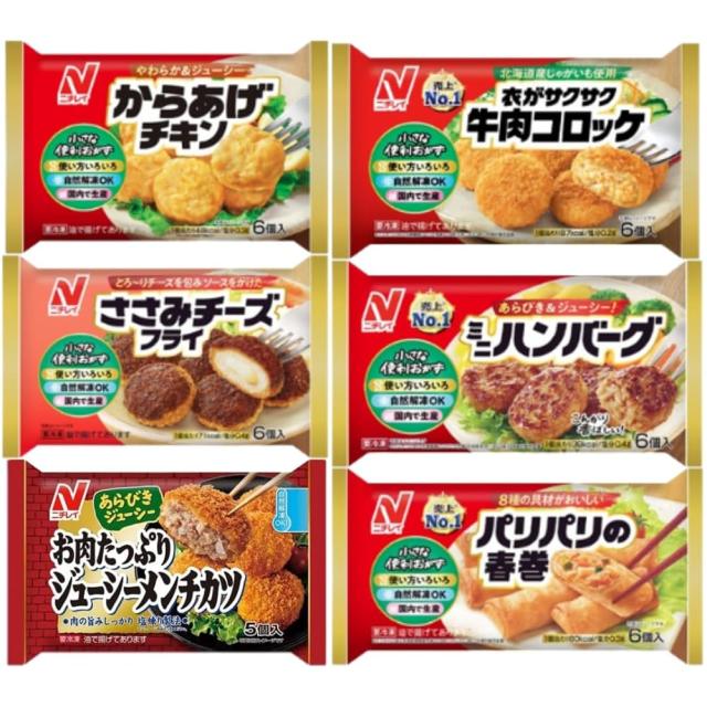 | 商品の説明 | 商品の説明 【からあげチキン】 鶏肉を一晩じっくり漬け込むことで、冷めてもやわらかく、ジューシーな唐揚げに仕上げています。 高知県産のしょうがと醤油を使い、ご飯に合う味に仕上げています。 原材料名:鶏肉(タイ又は国産(5%未満))、植物油脂、しょうゆ、粒状植物性たん白、砂糖、粉末状植物性たん白、発酵調味料、にんにくペースト、しょうが、衣(コーンフラワー、でん粉、食塩、小麦たん白加工品、香辛料、粉末しょうゆ、コーングリッツ、粉末卵白、モルトエキスパウダー)、揚げ油(大豆油)/加工でん粉、pH調整剤、増粘多糖類、乳化剤、酢、アセロラ濃縮果汁、(一部に小麦・卵・乳成分・大豆・鶏肉を含む) 【衣がサクサク牛肉コロッケ】 北海道十勝産じゃがいもを使用した、定番の牛肉コロッケです。 衣のサクサク感をお楽しみいただけます。 原材料名:野菜(ばれいしょ(国産)、たまねぎ)、牛肉、砂糖、しょうゆ、小麦粉加工品、パン粉、ビーフオイル、大豆加工品、みりん、食塩、粒状植物性たん白、香辛料、しょうゆ加工品、衣(パン粉、植物油脂、でん粉、粉末状植物性たん白、粉末卵白)、揚げ油(大豆油、なたね油)/加工でん粉、酢、アセロラ濃縮果汁、増粘剤(キサンタンガム)、(一部に小麦・卵・牛肉・大豆を含む) 【ささみチーズフライ】パン粉のサクサク感も楽しめます! ヘルシーな鶏ささみ肉でチーズをふんわりと包み、衣を付けて揚げました。衣のサクサク感が楽しめます。 自家製特製ソース! 野菜と果物を使ったほんのり甘辛いソースで仕上げています。 原材料名:鶏肉、粒状植物性たん白、チーズフード、つなぎ(パン粉、粉末状植物性たん白)、植物油脂、牛乳、チキンエキス、食塩、発酵調味料、チーズ、酢、衣(パン粉(国内製造)、植物油脂、でん粉、粉末卵白、コーンフラワー、食塩)、揚げ油(パーム油、なたね油)、ソース(中濃ソース)/加工でん粉、安定剤(加工でん粉、増粘多糖類)、増粘剤(加工でん粉、キサンタンガム)、酢酸(Na)、乳化剤、グリシン、甘味料(スクラロース)、リゾチーム、ショ糖脂肪酸エステル、アセロラ濃縮果汁、(一部に小麦・卵・乳成分・大豆・鶏肉・りんごを含む) 【ミニハンバーグ】 自然解凍で更に便利に! お客様のご要望にお応えし、自然解凍ができるようにしました。 ダブルベルトグリル製法 独自の「Wベルトグリル製法」で、表裏一気に焼き上げているから、外はこんがり香ばしく、中はふっくら冷めてもやわらかい! 原材料名:食肉(牛肉(輸入)、豚肉)、たまねぎ、粒状植物性たん白、つなぎ(パン粉、鶏卵、粉末卵白)、ぶどう糖、植物油脂、しょうゆ、ソテーオニオン、食塩、食物繊維、発酵調味料、香辛料、しょうゆ加工品、卵殻粉/加工でん粉、酢酸(Na)、グリシン、リゾチーム、ショ糖脂肪酸エステル、アセロラ濃縮果汁、(一部に小麦・卵・乳成分・牛肉・大豆・豚肉を含む) 【お肉たっぷりジューシーメンチカツ】 あらびきジューシー! 肉をしっかり塩練りすることで、旨みがジュワッとしみだすジューシーなメンチカツです。 原材料名:食肉(豚肉(輸入)、牛肉)、たまねぎ、つなぎ(パン粉、卵白)、牛脂、豚脂、粒状植物性たん白、砂糖、ビーフエキス、ソテーオニオン、食塩、ビーフオイル、たん白加水分解物、しょうゆ、香辛料、ゼラチン、衣(パン粉、植物油脂、小麦粉、粉末卵白、粉末状植物性たん白、脱脂粉乳)、揚げ油(パーム油、なたね油)/加工でん粉、調味料(アミノ酸等)、増粘剤(キサンタンガム)、ゲル化剤(ジェランガム)、乳酸Ca、ベーキングパウダー、(一部に小麦・卵・乳成分・牛肉・大豆・豚肉・ゼラチンを含む) 【パリパリの春巻】 パリパリの食感! レンジ調理でも、自然解凍でもパリパリの皮をお楽しみいただけます。 ねぎ油で風味豊かに! ねぎ油を加え、香りとコクが追加されたことで、味わい深い春巻に仕上がりました。 原材料名:皮(小麦粉(国内製造)、植物油脂、デキストリン、でん粉、ショートニング、粉末状植物性たん白、加工油脂、食塩、果糖加工品)、野菜(たけのこ、にんじん、たまねぎ、にら)、粒状植物性たん白、しょうゆ、砂糖、チキンコンソメパウダー、しいたけ、発酵調味料、豚肉、乾燥キャベツ、はるさめ、香味油、上湯(鶏骨、野菜(たまねぎ、にんじん)、生ハム、干し貝柱)、食塩、酵母エキス、粉末卵白、揚げ油(大豆油、なたね油)/加工でん粉、増粘剤(加工でん粉、キサンタンガム)、乳化剤、酢、アセロラ濃縮果汁、(一部に小麦・卵・大豆・鶏肉・豚肉を含む) 原材料・成分 鶏肉(タイ又は国産(5%未満))、植物油脂、しょうゆ、粒状植物性たん白、砂糖、粉末状植物性たん白、発酵調味料、にんにくペースト、しょうが、衣(コーンフラワー、でん粉、食塩、小麦たん白加工品、香辛料、粉末しょうゆ、コーングリッツ、粉末卵白、モルトエキスパウダー)、揚げ油(大豆油)/加工でん粉、pH調整剤、増粘多糖類、乳化剤、酢、アセロラ濃縮果汁、(一部に小麦・卵・乳成分・大豆・鶏肉を含む) 野菜(