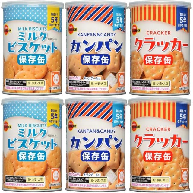 【 保存缶 6缶セット 】 ブルボン ミルクビスケット + カンパン + クラッカー 日本災害食 防災 保存食 保存缶 備蓄食 非常食 5年保存