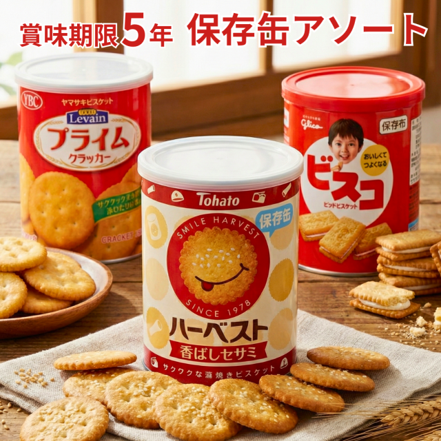 【 保存缶 3缶セット 】 東ハト ハーベスト 香ばしセサミ + YBC ルヴァン + ビスコ 防災 保存食 備蓄食 非常食 5年保存 アソート