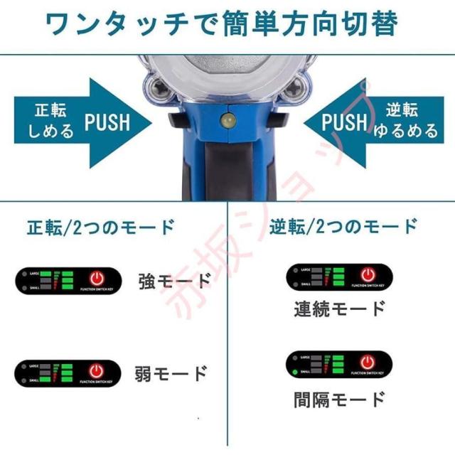 【無段変速・正逆転両用・安全ロック】:「回転+打撃」でパワフルインパクト機構、LEDライト付無段変速インパクトレンチです。正逆転レバーの位置を調整することで、ビットの回転方向を切り替えでき、ネジを締め付けるだけでなく、ネジを緩めることも可能です。
