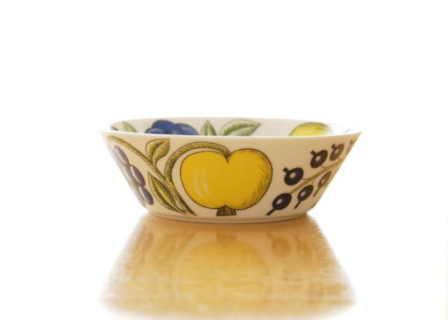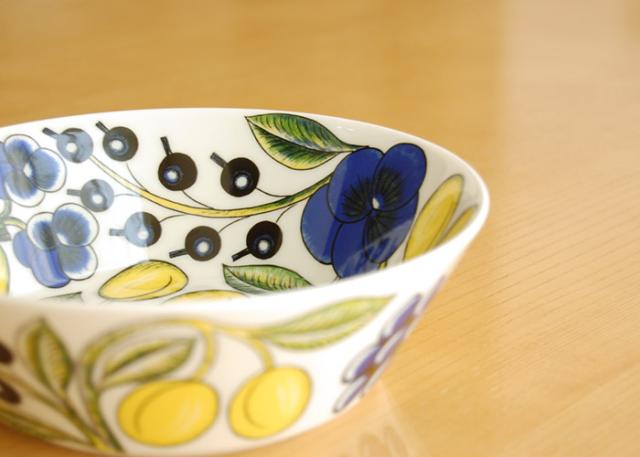 シンプルなフォルムに、パンジーやカシス、ぶどう、りんごなどの瑞々しい花やフルーツのモチーフが華やかに描かれたARABIA(アラビア)パラティッシ。 1969年から作られているアラビアのクラシックシリーズとして、時代を超えて今もなお愛され続けています。 フィンランド陶芸界で最も知られる人物のひとりであるビルガー・カイピアイネンによる名作。 ブルー&イエローのカラータイプは初期のデザイン。 パラティッシはフィンランド語で"楽園"を意味します。