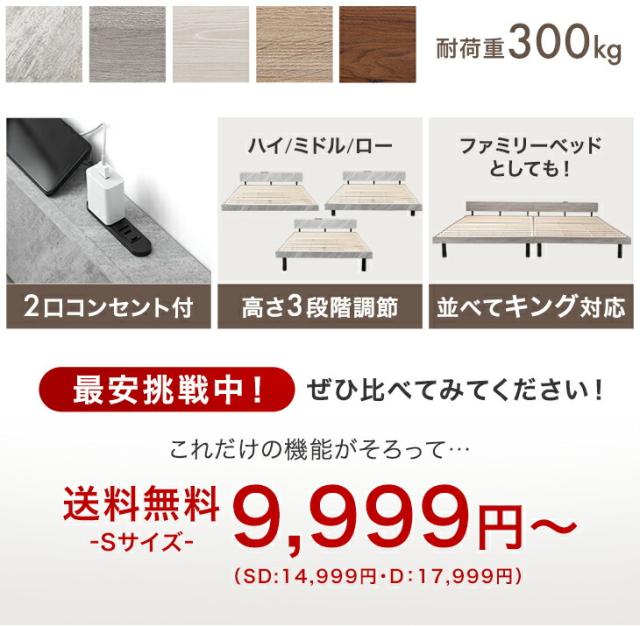 【本日P5%還元】 《最安挑戦中》RENEW 宮棚付きベッド 高さ調節 3段階 コンセント付き キング対応 ダブルベッド ベッドフレーム すのこベッド すのこベット ベット ベットフレーム 宮付き ベッド