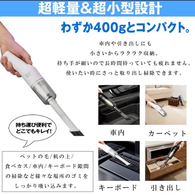 コードレス USB typeC 充電 なので、お使いの場所に制限がなく、軽いので 持ち運びにも便利です。 ペットの毛 机の上 食べカス 車内 キーボード 隙間 の掃除など様々な場所のゴミをしっかり吸い込みます。効率よくあらゆる場所での掃除が可能です。また、逆流防止弁が付いているので、使用時に中からゴミが落ちてこない設計になっています。連続運転時間:約20分