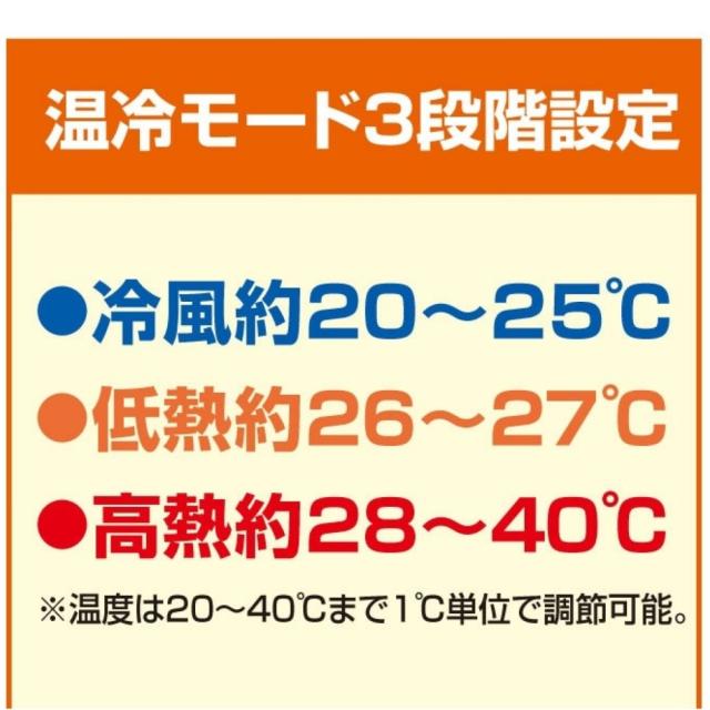 温冷モード:冷風(約20〜25℃)・低熱(約26〜27℃)・高熱(約28〜40℃)