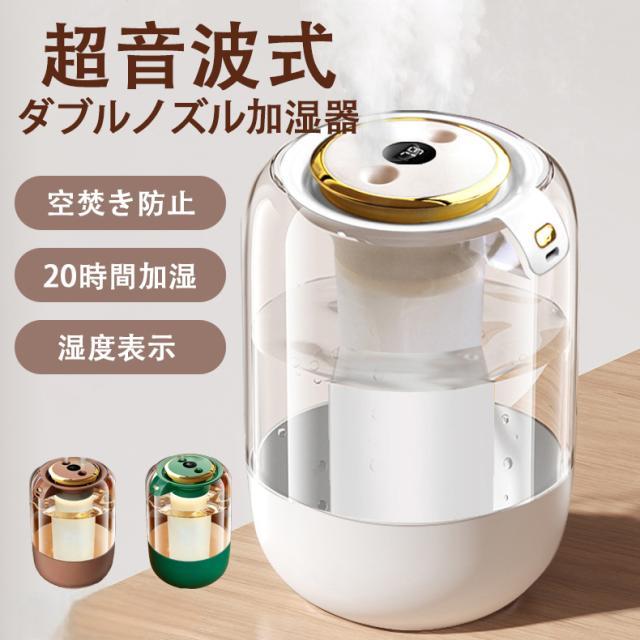 加湿器 超音波式 卓上 大容量 ダブルノズル デュアル噴霧口 2L USB式 自動停止機能 静音 加湿機 空焚き防止 省エネ 節電 湿度表示 LEDライト 20時間加湿 乾燥対策 室内 保湿 乾燥 花粉