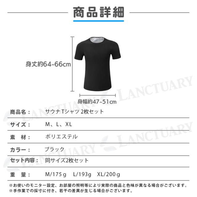 | 主な仕様 | 商品名: サウナ Tシャツ 2枚セット サイズ: M、L、XL カラー:ブラック セット内容: 2枚セット 重量:M/175g L/193g XL/200g |
