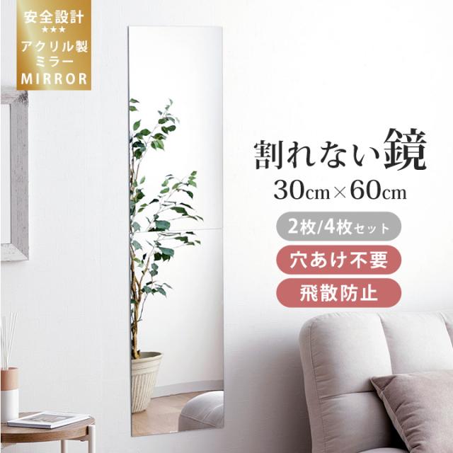 「 割れないミラー 」 2枚セット アクリル 30×60×0.2cm 壁掛け 鏡 飛散防止 穴あけ不要 簡単設置 貼るだけ 新生活