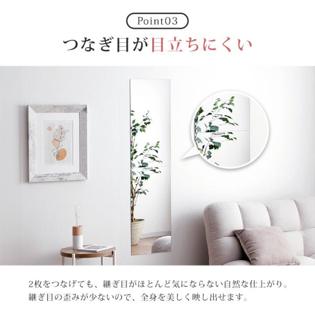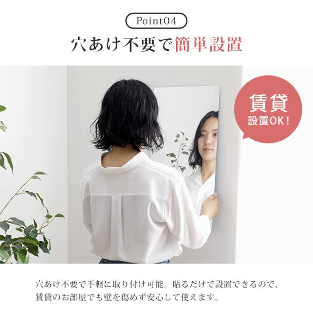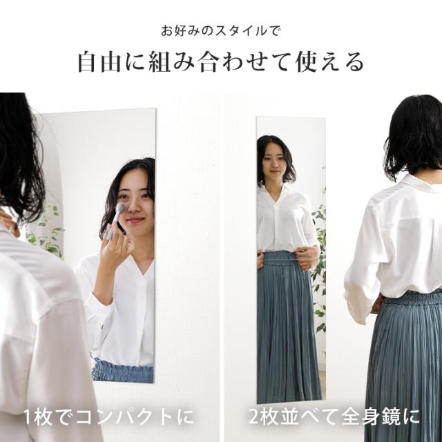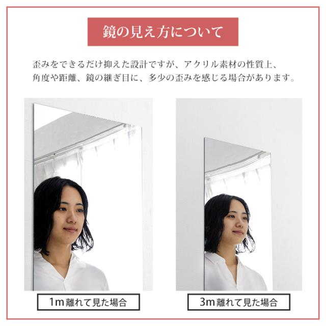 | ■ ガラス不使用のアクリル製で、落としても割れにくく安心。 ■ ガラス製ミラーのようにクリアで美しい映り。歪みが少なく、毎日のメイクや身支度に最適なミラーです。 ■ お好みのスタイルで自由に組み合わせて使える。 ■ 2枚つなげても、継ぎ目がほとんど気にならない自然な仕上がり。 ■ 穴あけ不要で手軽に取り付け可能。 |